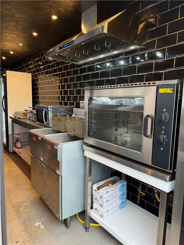 3 pan electric frying range with chip dump & griddle 4 pot bain marie with two serving aeras one lifts up for access fully serviced in February has a two tank Ansull fire suppression unit fitted as extra quantity of ducting also included around...